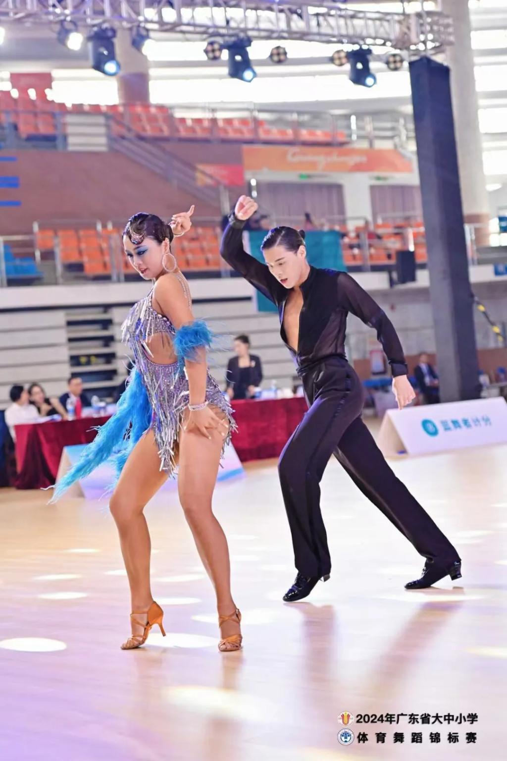 本次比赛在广东外语外贸大学体育馆的宽敞舞台上拉开帷幕,比赛涵盖了多个舞种,包括浪漫的伦巴、拉丁、活力四射的恰恰等。现场气氛热烈非凡,舞台上灯光璀璨,参赛选手们身着华丽的舞衣,个个精神抖擞,准备在舞台上大放异彩。